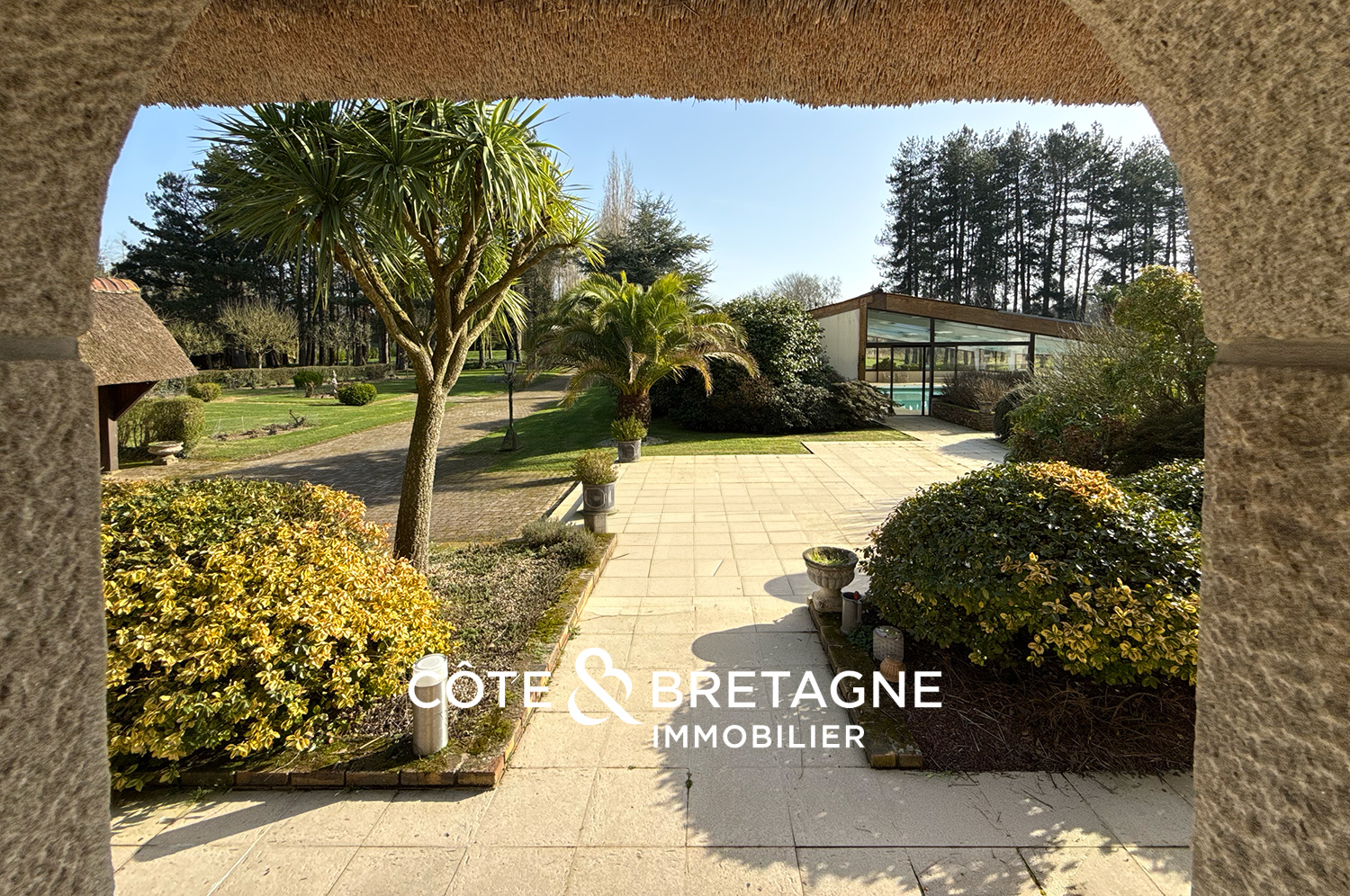À l’extérieur, un carport pouvant accueillir trois véhicules s’intègre avec beaucoup de caractère à l’ensemble architectural, grâce à sa couverture en chaume qui rappelle celle de la maison. Un local technique d’environ 100 m² permet d’abriter le matériel nécessaire à l’entretien du domaine, tandis qu’un chenil vient compléter les aménagements existants. Ces équipements, pensés avec cohérence, renforcent la fonctionnalité de cette propriété avec grand terrain dans la baie de Saint-Brieuc, sans jamais altérer l’esthétique du lieu.