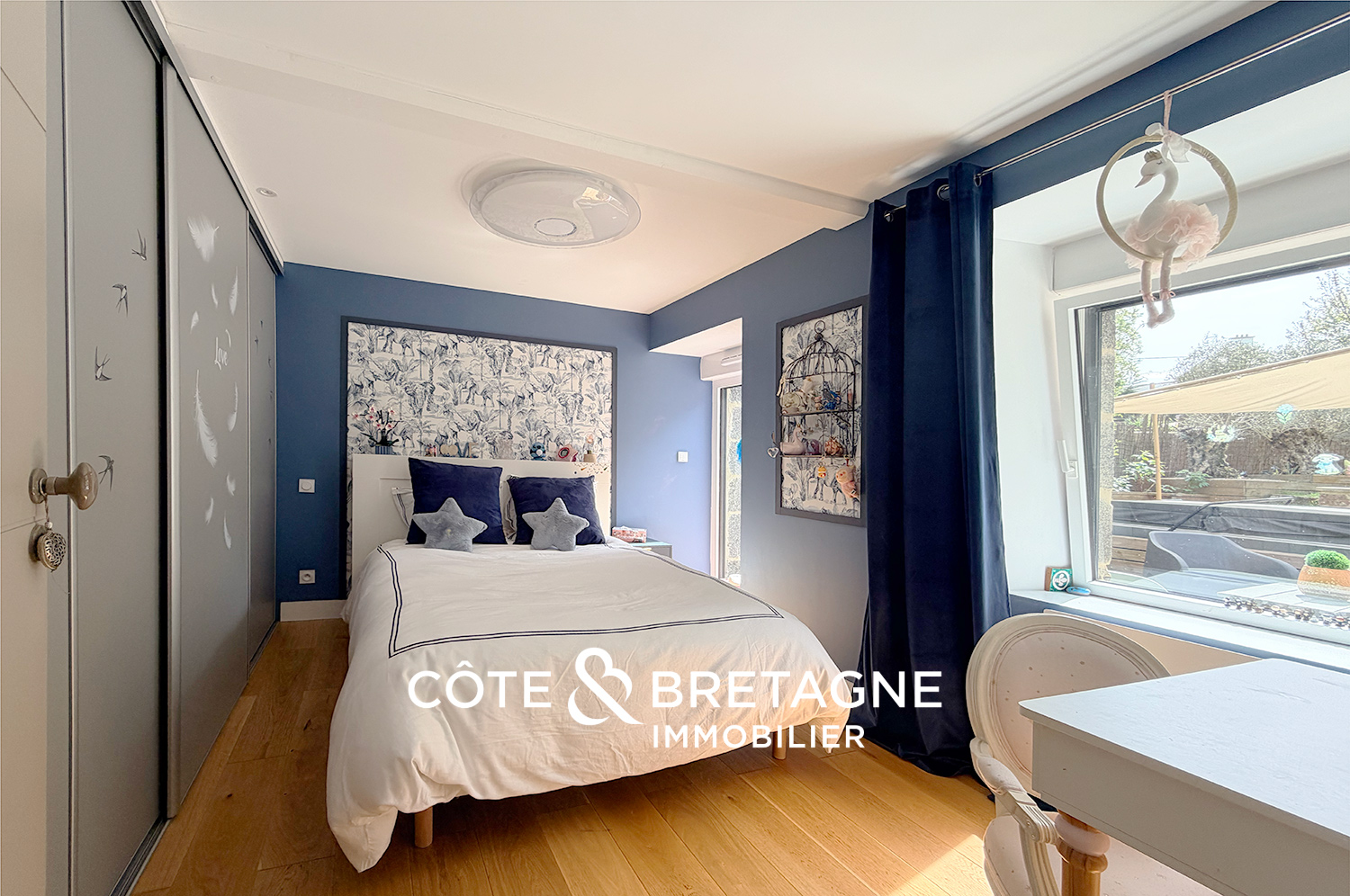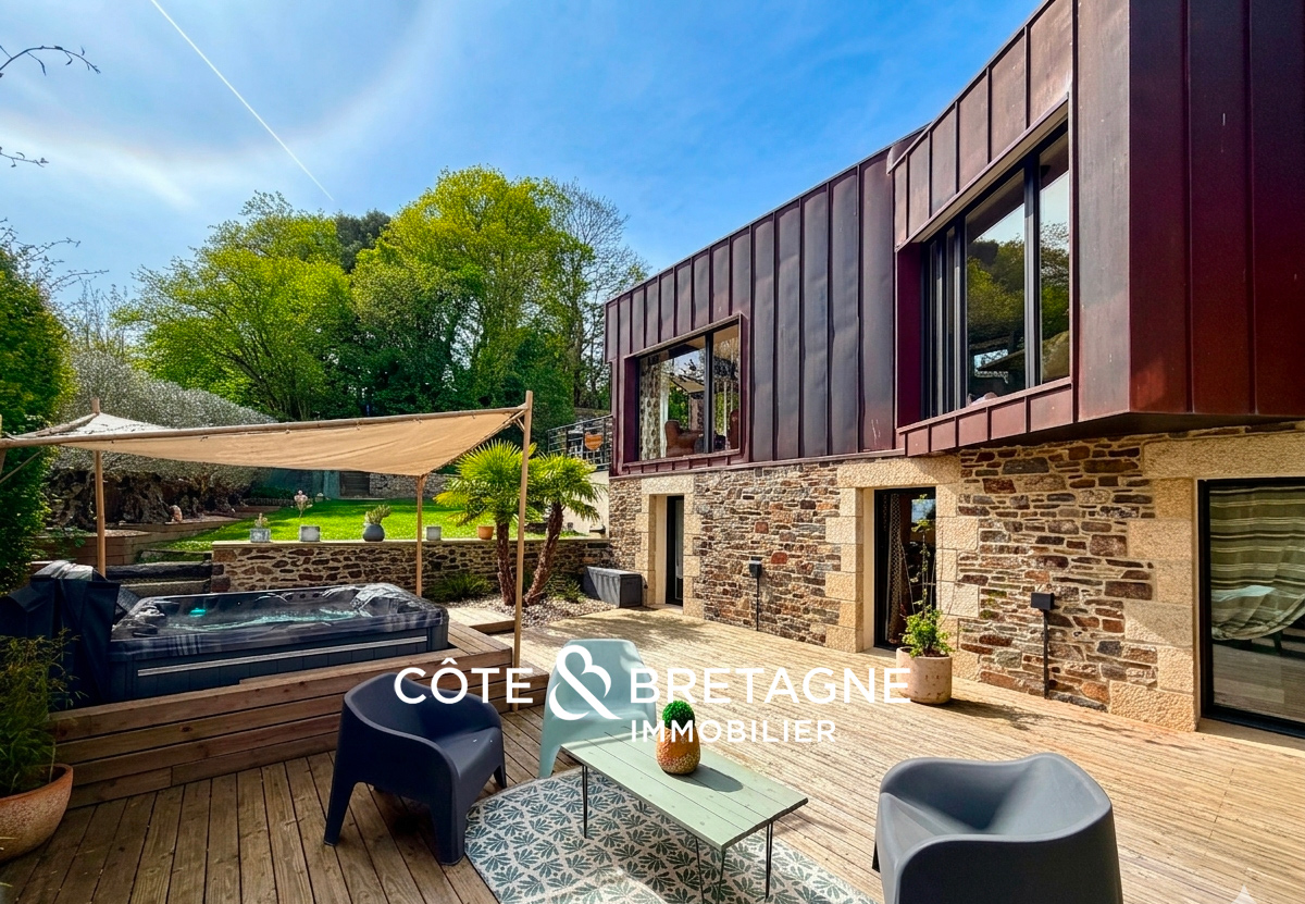 À l’abri des regards, au cœur de Binic, cette propriété dévoile une écriture architecturale singulière où la noblesse de la pierre ancienne dialogue avec une extension contemporaine parfaitement intégrée. L’ensemble compose une silhouette élégante, équilibrée, où chaque ligne semble pensée pour capter la lumière et prolonger les volumes vers le jardin. La rénovation, menée en 2019 avec une attention particulière aux matériaux et aux finitions, confère à la maison une atmosphère douce et actuelle, empreinte de sérénité.