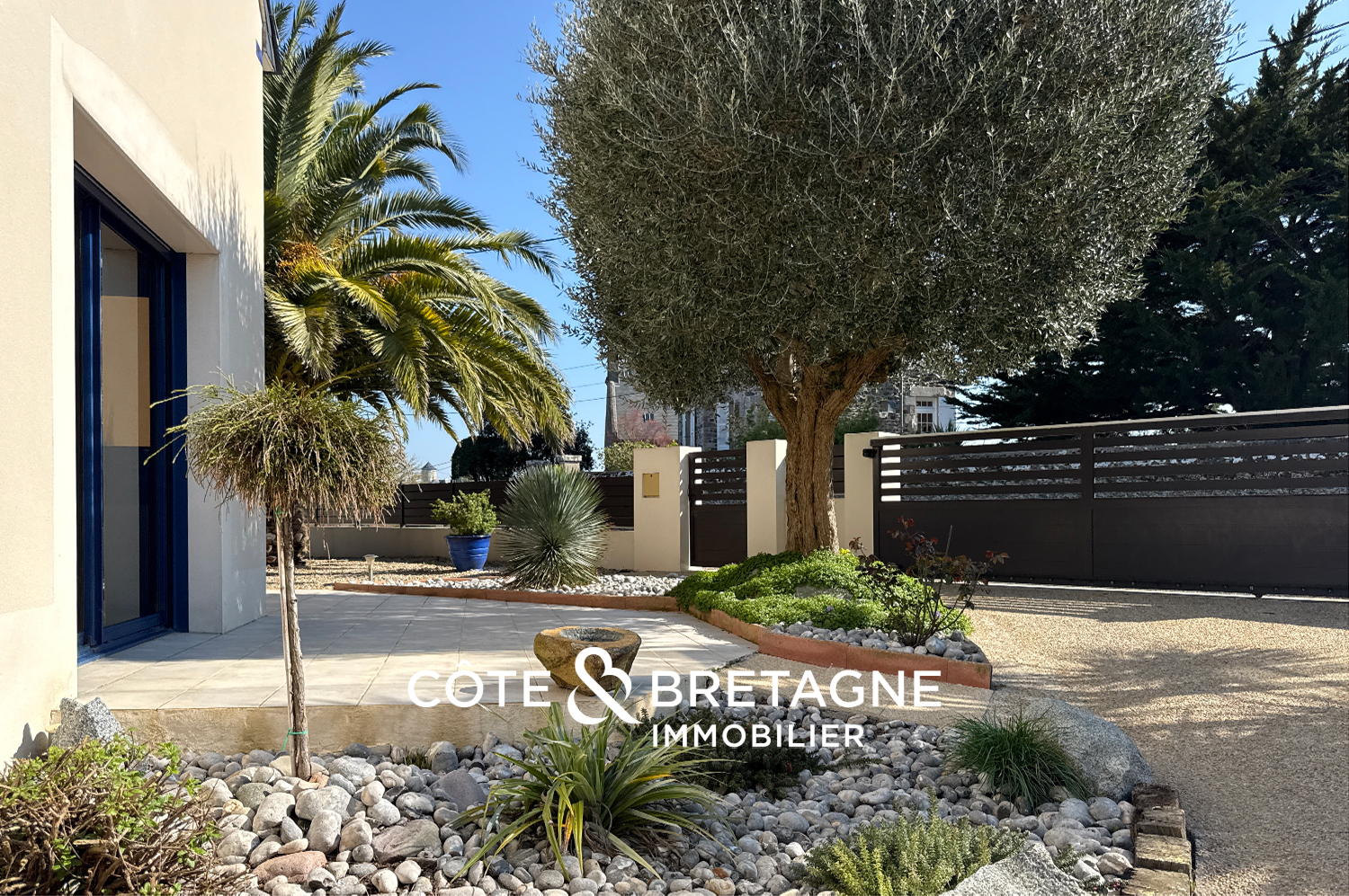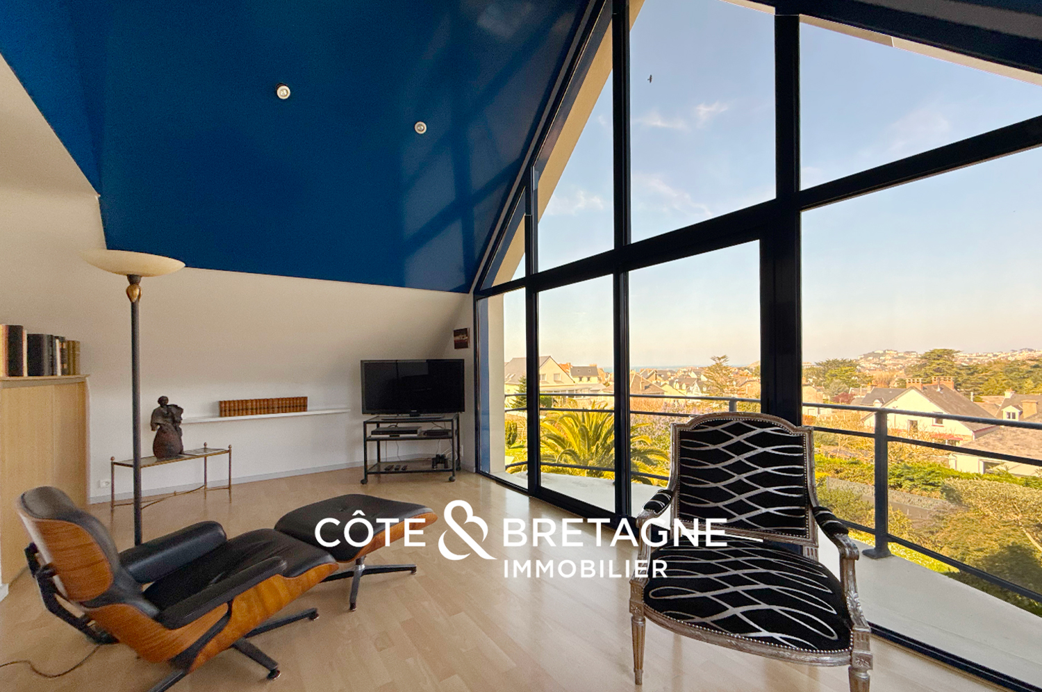 Baignée de lumière tout au long de la journée grâce à une orientation idéale, la maison s’inscrit dans un magnifique écrin de verdure et bénéficie d’une vue dégagée avec la mer à l’horizon et une perspective remarquable sur le Verdelet, renforçant immédiatement le caractère exclusif du bien. Son architecture contemporaine élégante, ses volumes et son harmonie avec la nature environnante en font une propriété particulièrement recherchée sur le secteur du Val-André, station balnéaire prisée de la côte bretonne.