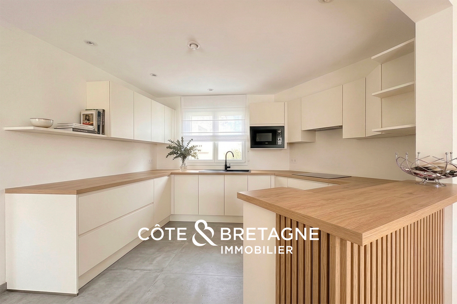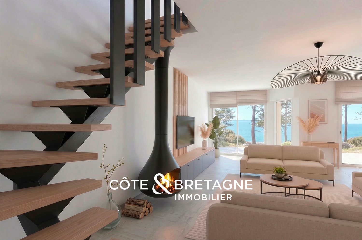 Dès l’entrée, la maison dévoile des volumes sincères, organisés avec fluidité. La pièce de vie, animée par la présence d’une cheminée, s’ouvre naturellement vers l’extérieur et capte la lumière changeante du littoral. La cuisine, dans son prolongement, participe à cette harmonie d’ensemble, tandis que les espaces de service: salle d’eau, buanderie et garage, apportent un confort discret au quotidien.