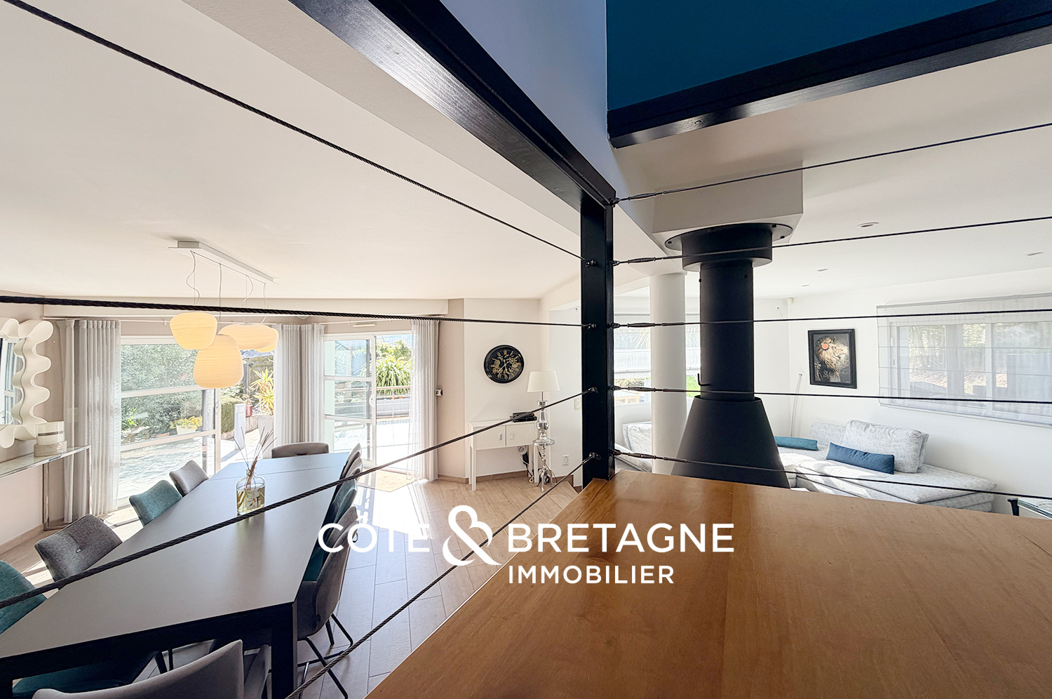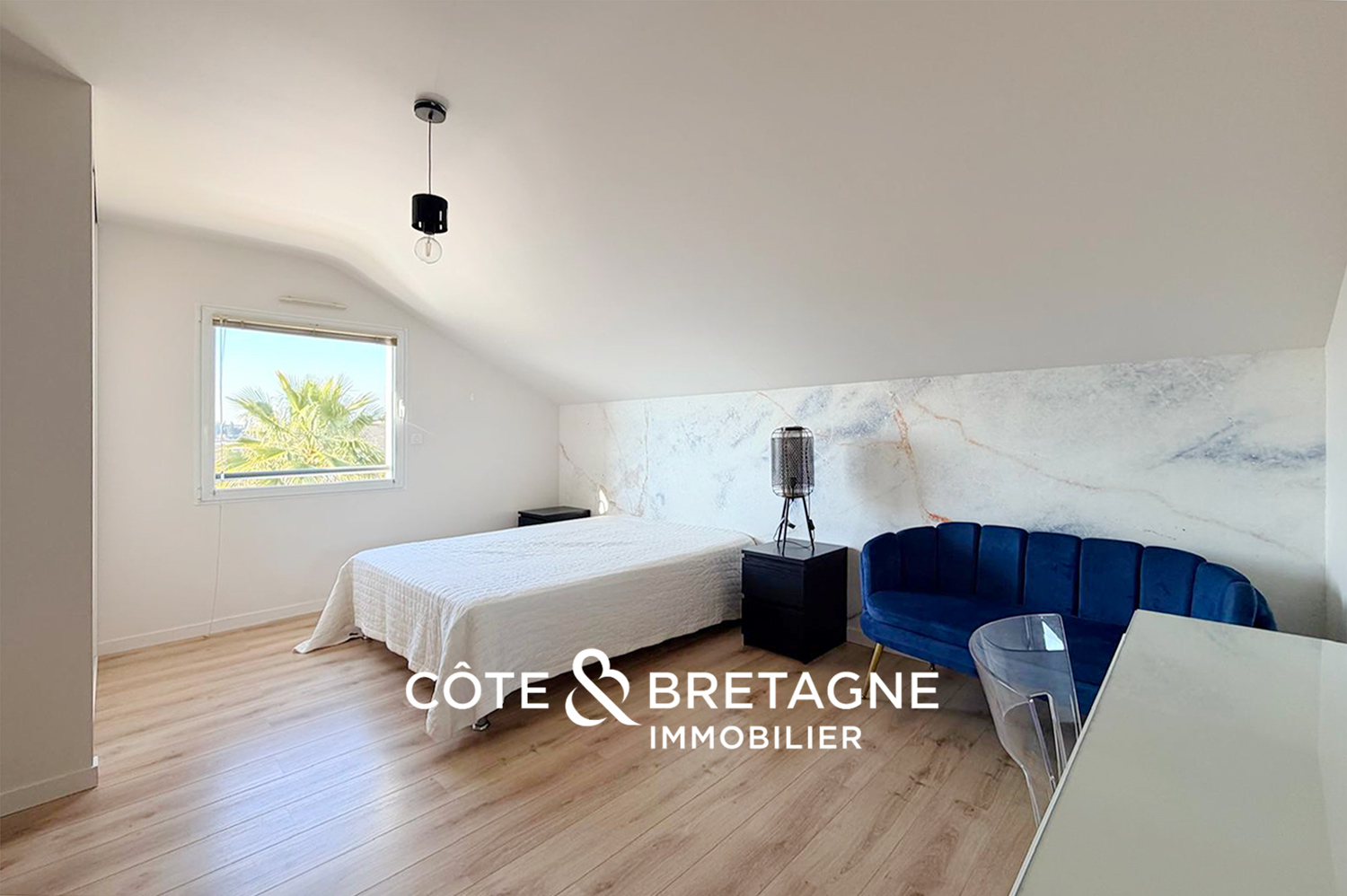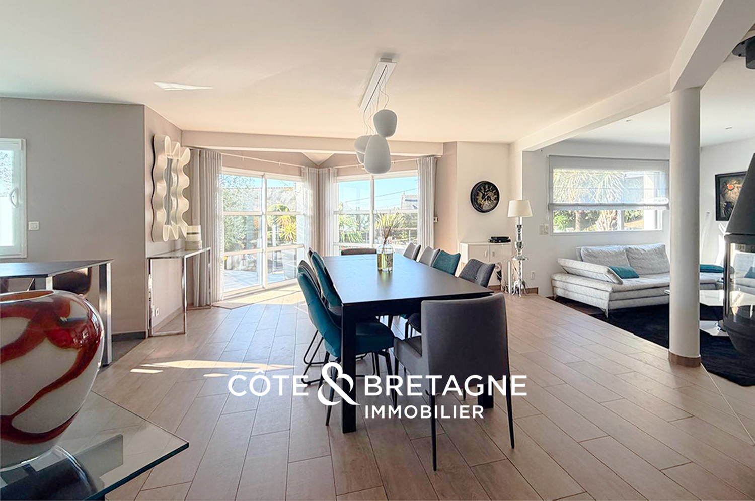 À Plérin, à proximité immédiate du port du Légué, cette maison contemporaine de sept pièces révèle une écriture architecturale soignée, pensée pour conjuguer confort de vie et esthétisme. Implantée sur un terrain clos et arboré de 1 120 m², elle s’inscrit dans un environnement résidentiel recherché, où la quiétude se mêle à la proximité du littoral.