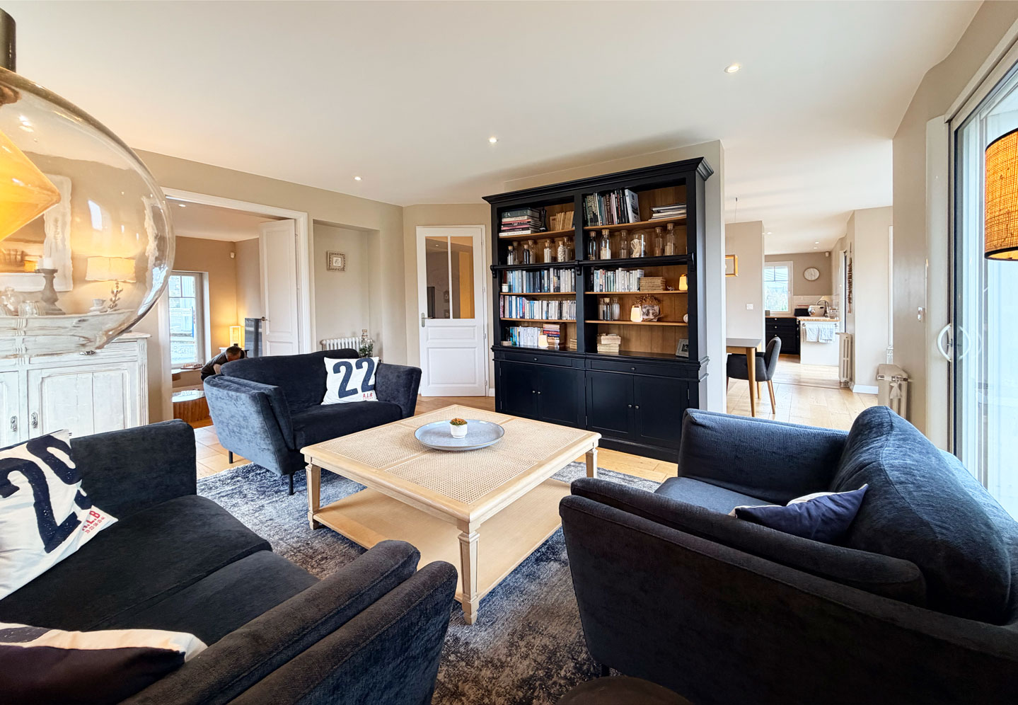 Dès l’entrée, le ton est donné : l’espace est là, maîtrisé, ouvert, sans excès. Les pièces de vie s’articulent avec évidence autour d’une circulation centrale. Le salon principal, baigné de lumière grâce à de larges baies vitrées à galandage, s’ouvre directement sur une terrasse orientée plein sud, prolongeant la vie intérieure vers l’extérieur. À ses côtés, la salle à manger et la cuisine, aménagée et équipée avec des prestations haut de gamme, participent à une ambiance chaleureuse et fonctionnelle. Un second salon, plus intime, complète les espaces de détente. Une arrière cuisine bien pensée et discrète s’intègre parfaitement au rez-de-chaussée.