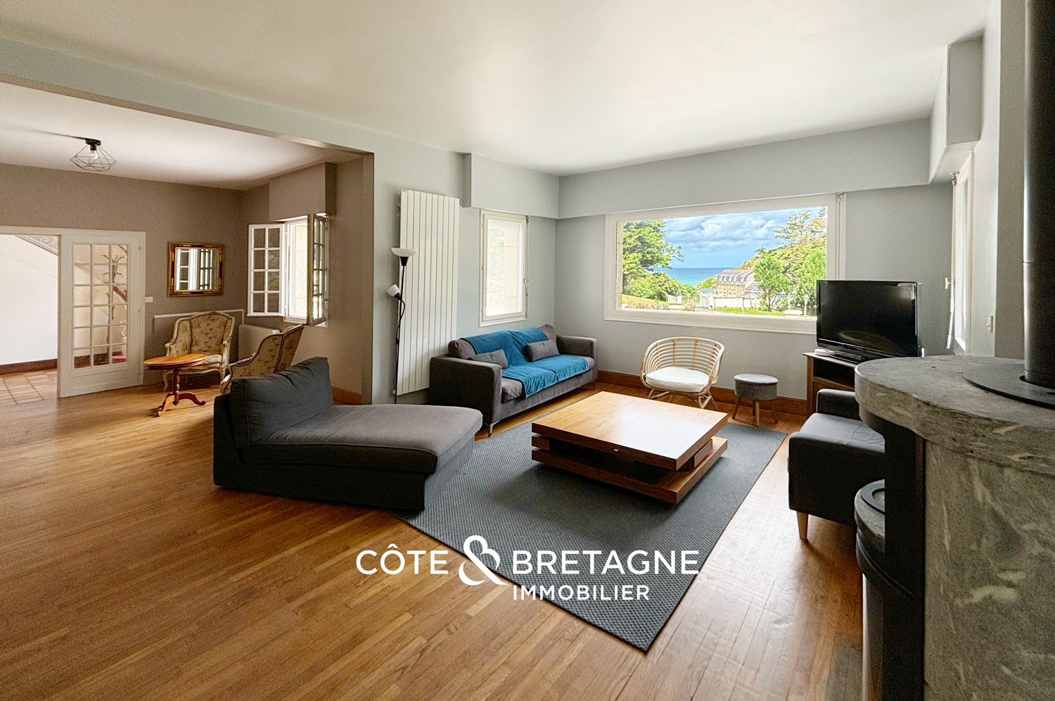 En franchissant le seuil, vous serez accueilli par une belle entrée qui mène à un grand séjour-salon baigné de lumière. Cet espace de vie, agrémenté d’un poêle à bois, offre une belle vue sur la mer. La cuisine fonctionnel est aménagée et équipée est parfaite pour prendre le petit-déjeuner à plusieurs. L’espace véranda non chauffée est l’endroit idéal pour se détendre grâce à sa vue agréable sur le parc.
