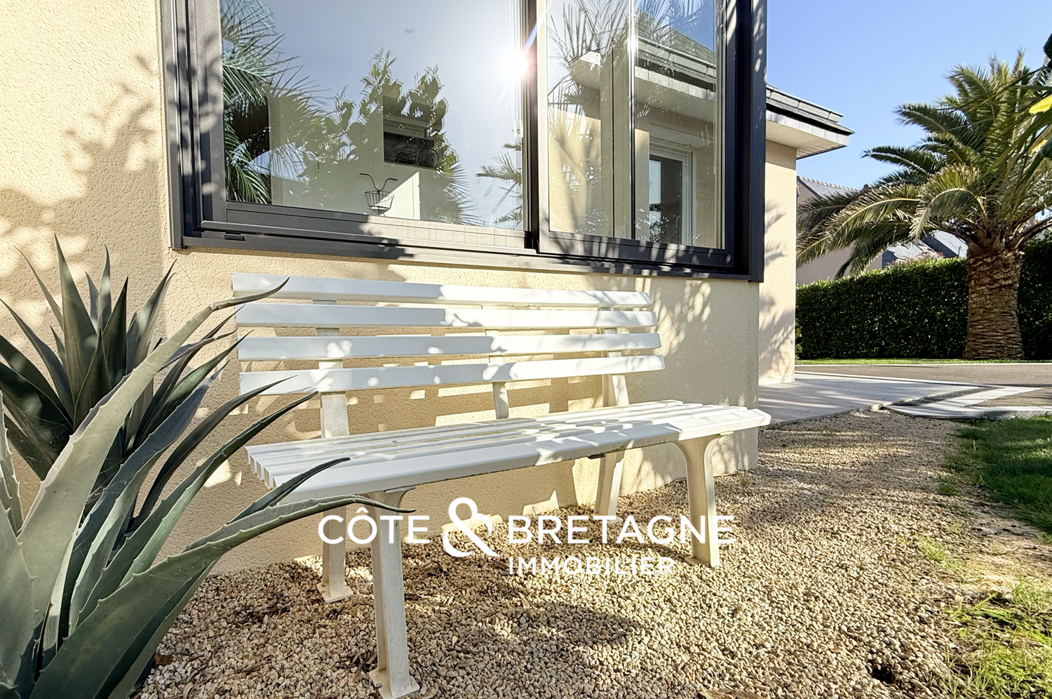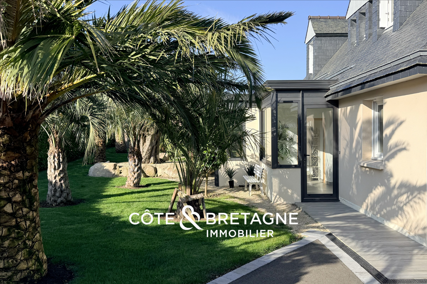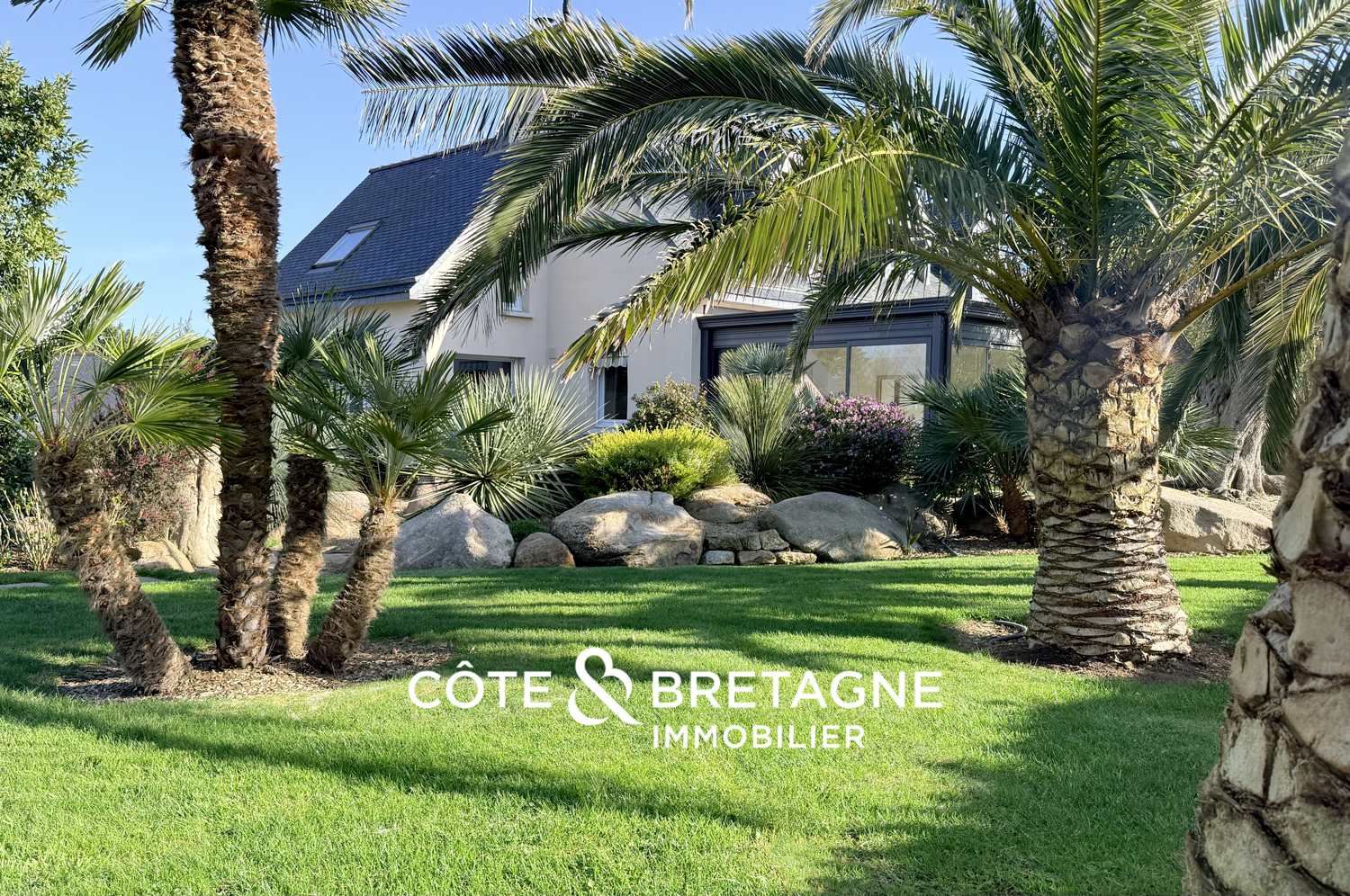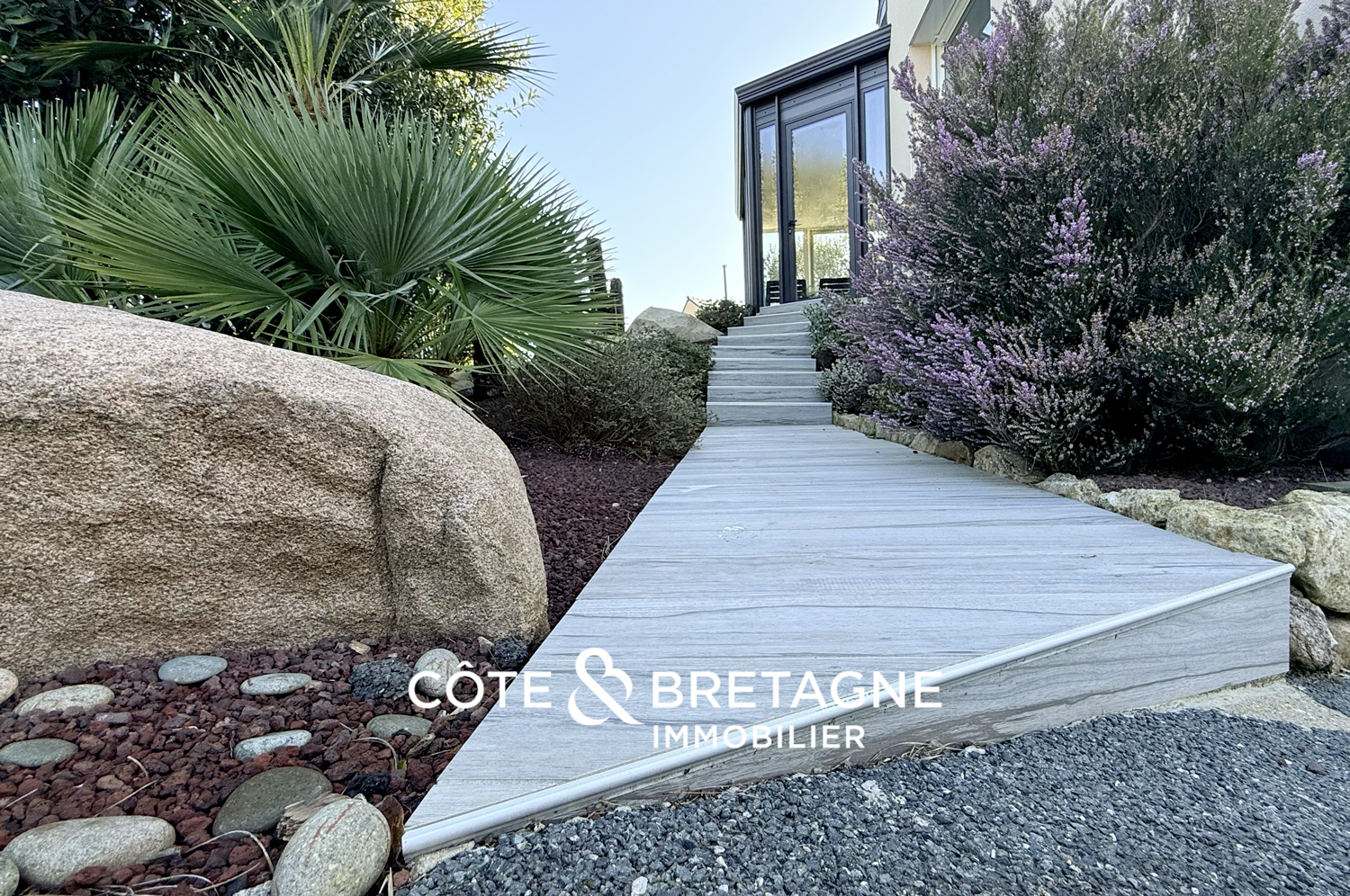 Le jardin, entièrement conçu par un paysagiste, est un véritable écrin où de majestueux palmiers s’élèvent aux côtés de deux oliviers, dont l’un âgé de plus de 800 ans. Des grisélines et des fougères arborescentes de Tasmanie enrichissent la végétation et apportent une touche d’exotisme, tandis que des camélias aux fleurs rouges viennent illuminer l’espace de délicates touches colorées. L’allée et ses enrochements de granit, évoquent subtilement la Côte de Granit Rose et confère au jardin un caractère à la fois authentique et poétique. L’ensemble crée ainsi une atmosphère sereine, où chaque pas invite à la détente et à la contemplation.
