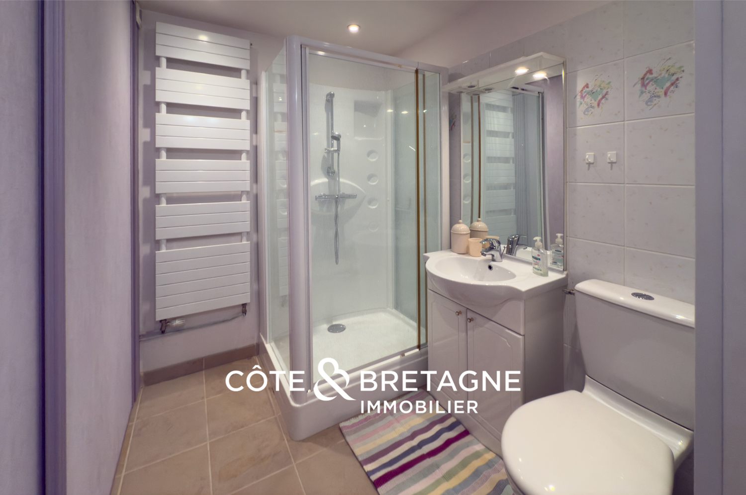 Un séjour lumineux, prolongé par de grandes baies vitrées, vous invitent à profiter pleinement du jardin paysager et de la vue sur la baie de Perros-Guirec. La verrière, accessible par une porte à galandage, s’ouvre d’un côté sur la cuisine et de l’autre sur le jardin, offrant un espace propice à la détente.