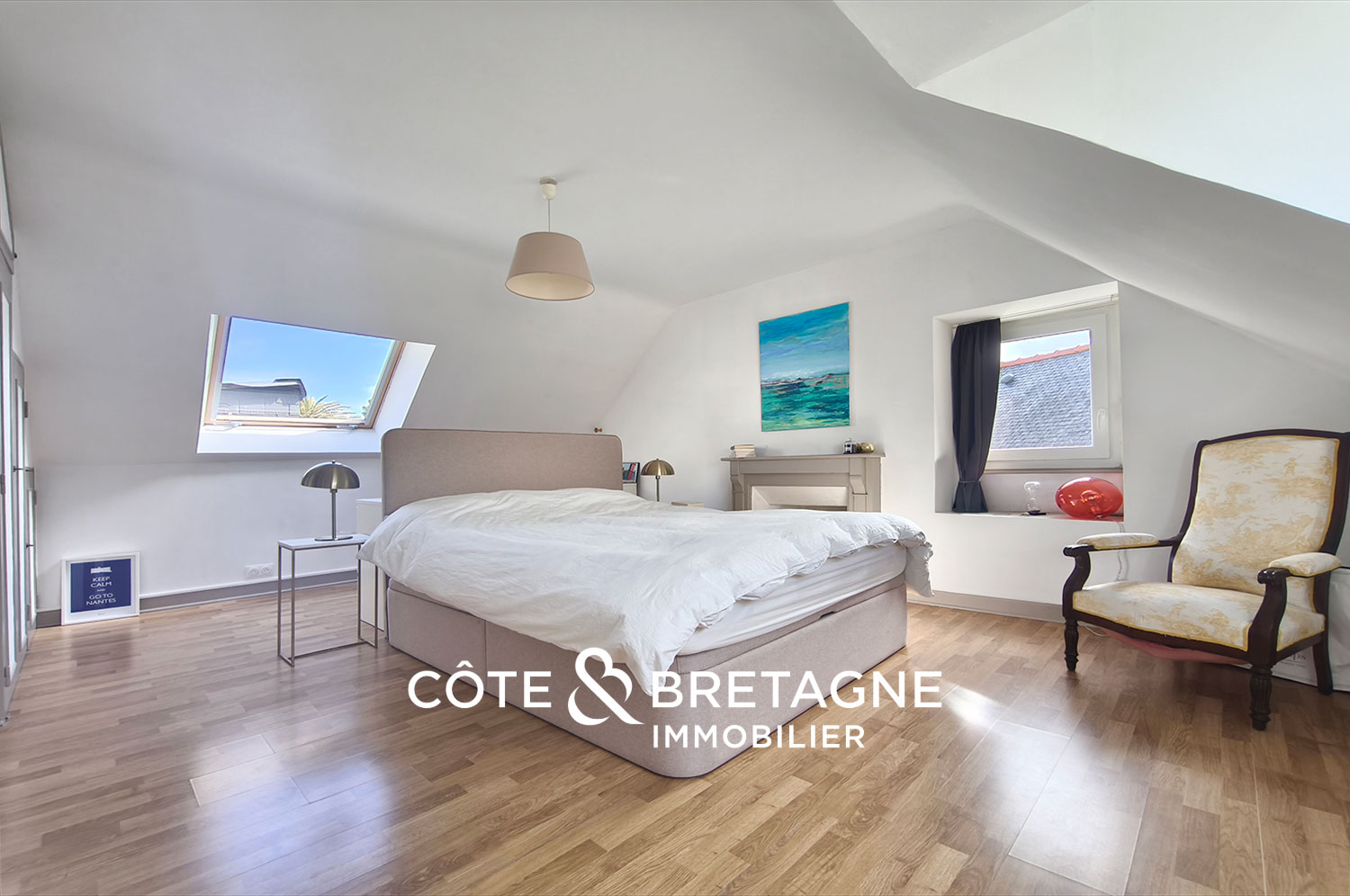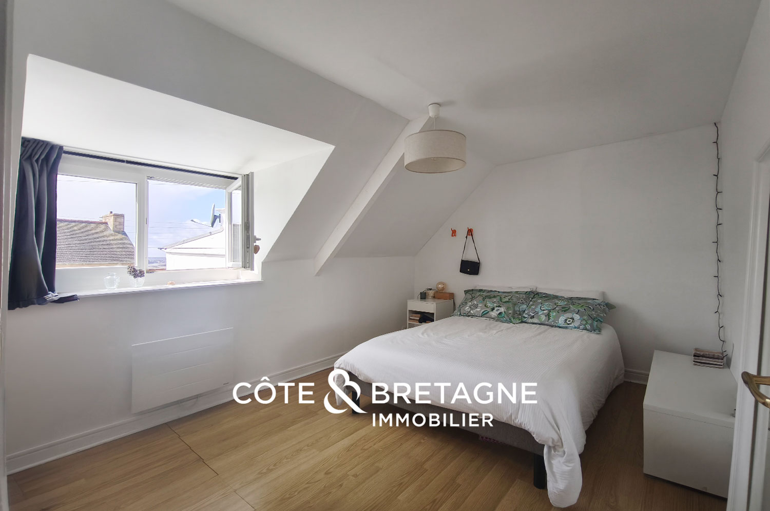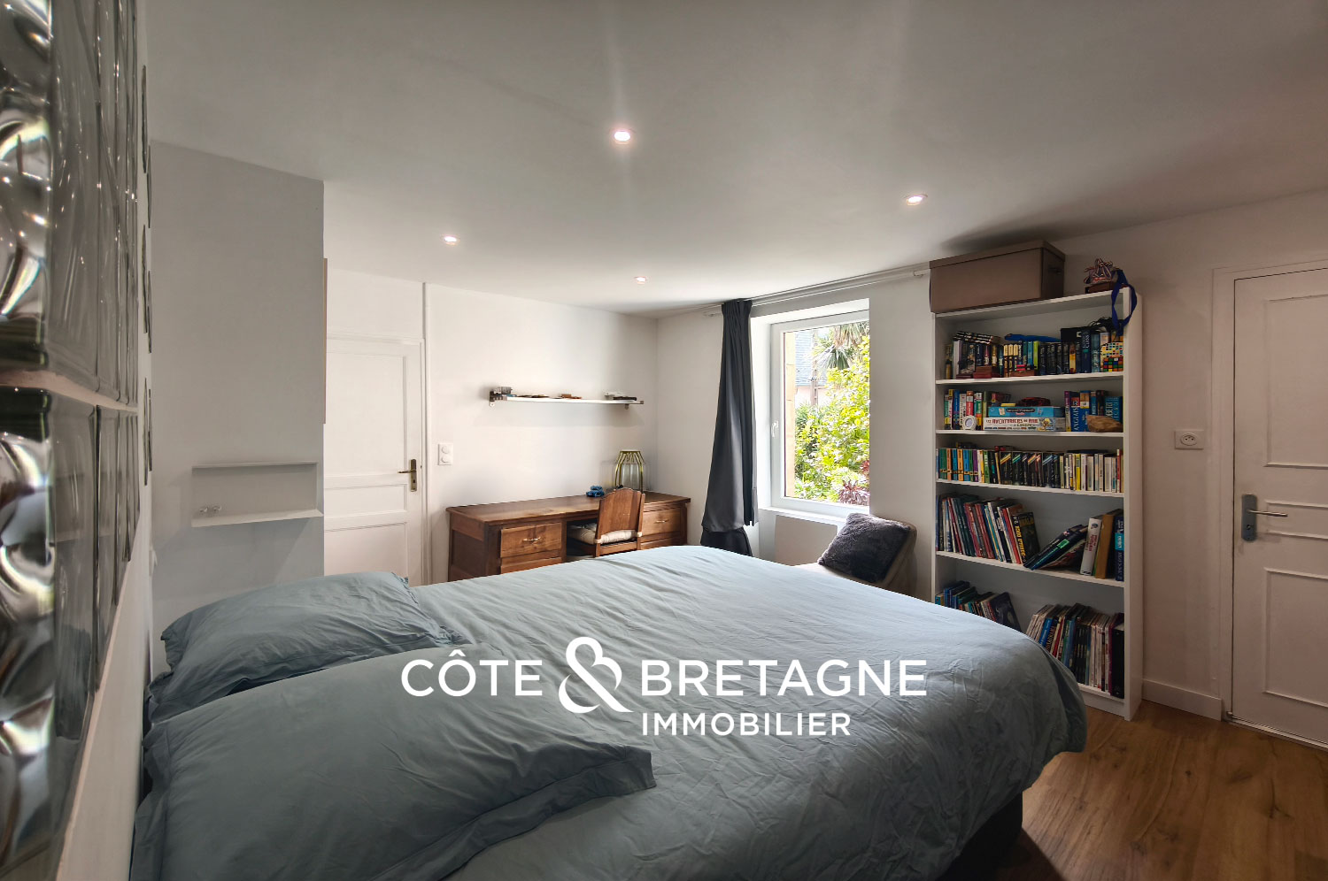 À l’étage, deux chambres avec placards, un bureau et une salle d’eau complètent l’ensemble, toujours avec cette présence constante de la mer en toile de fond.