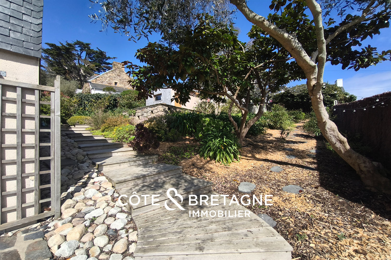 À l’extérieur, les deux terrasses à différents niveaux du jardin permettent d’apprécier la vue imprenable sur l’île Saint-Riom selon les moments de la journée. Deux cabanons de jardin viennent parfaire les prestations.