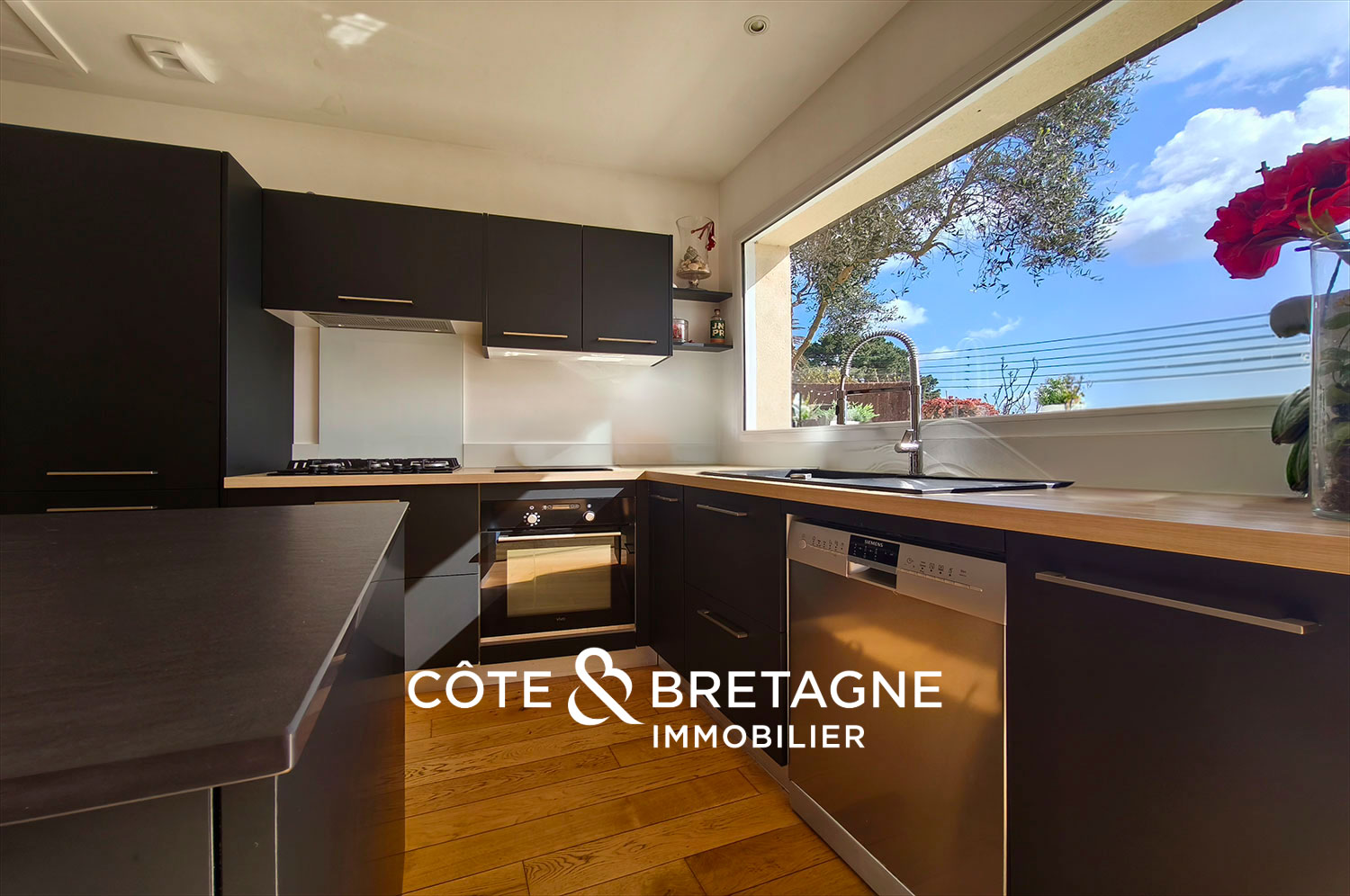 La cuisine aménagée et équipée, sublimée par un plan de travail en pierre noire, s’intègre harmonieusement à l’ensemble.