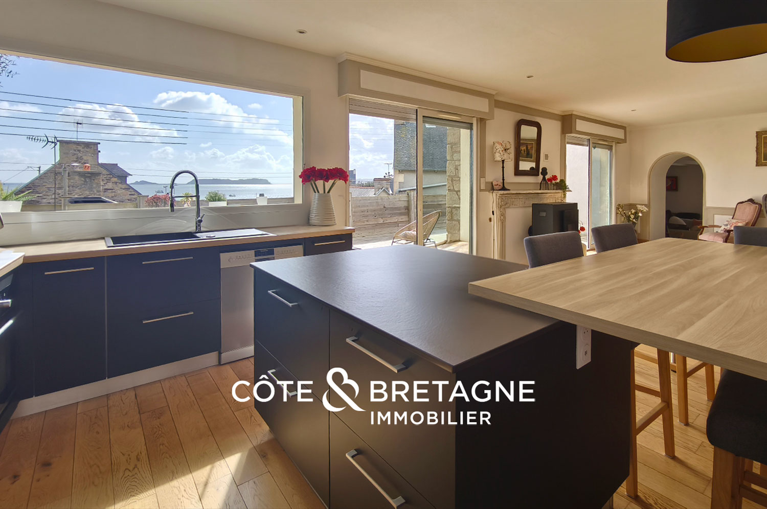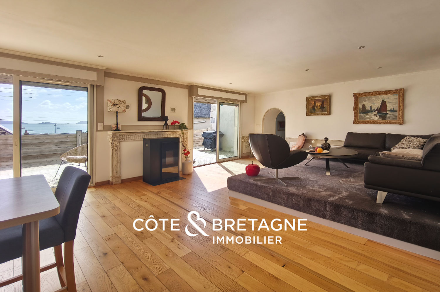 Une ancienne cheminée en marbre et un poêle à granulés viennent réchauffer l’atmosphère, tandis qu’un salon surélevé permet d’admirer la mer confortablement installé.