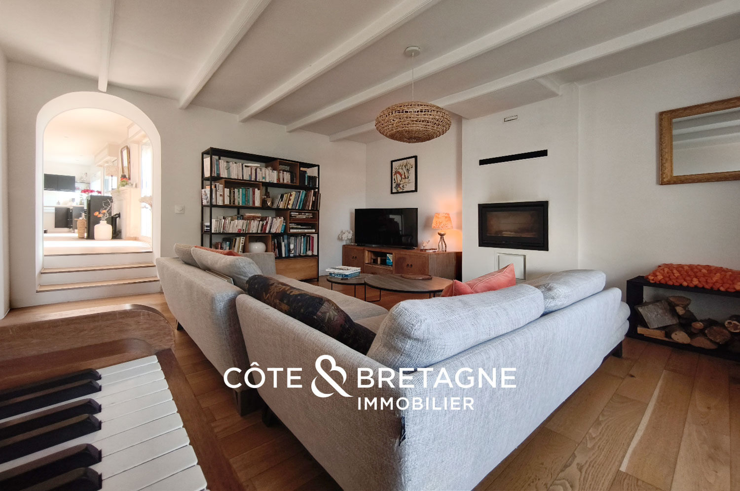 Un second salon, avec poutres apparentes, invite à des moments de détente au coin du feu, avec son insert, dans une atmosphère plus intimiste.