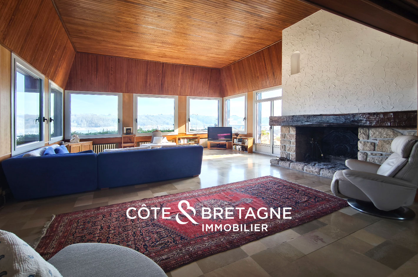 Dès l’entrée, la pièce principale de près de 60 m² impressionne par ses volumes et ses ouvertures panoramiques. La lumière naturelle traverse l’espace, mettant en valeur la vue sur le Trieux d’un côté et le parc verdoyant de l’autre.