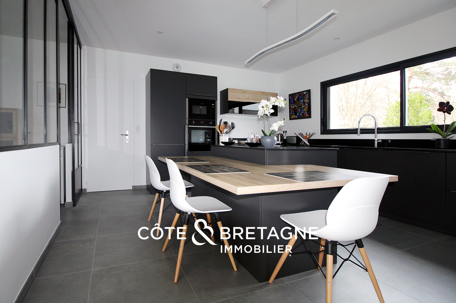 La cuisine ouverte, élégamment intégrée, se distingue par sa fonctionnalité et son esprit contemporain. Elle s’organise autour d’une table suspendue et se prolonge par une verrière de style atelier abritant un cellier, alliant esthétique et praticité.