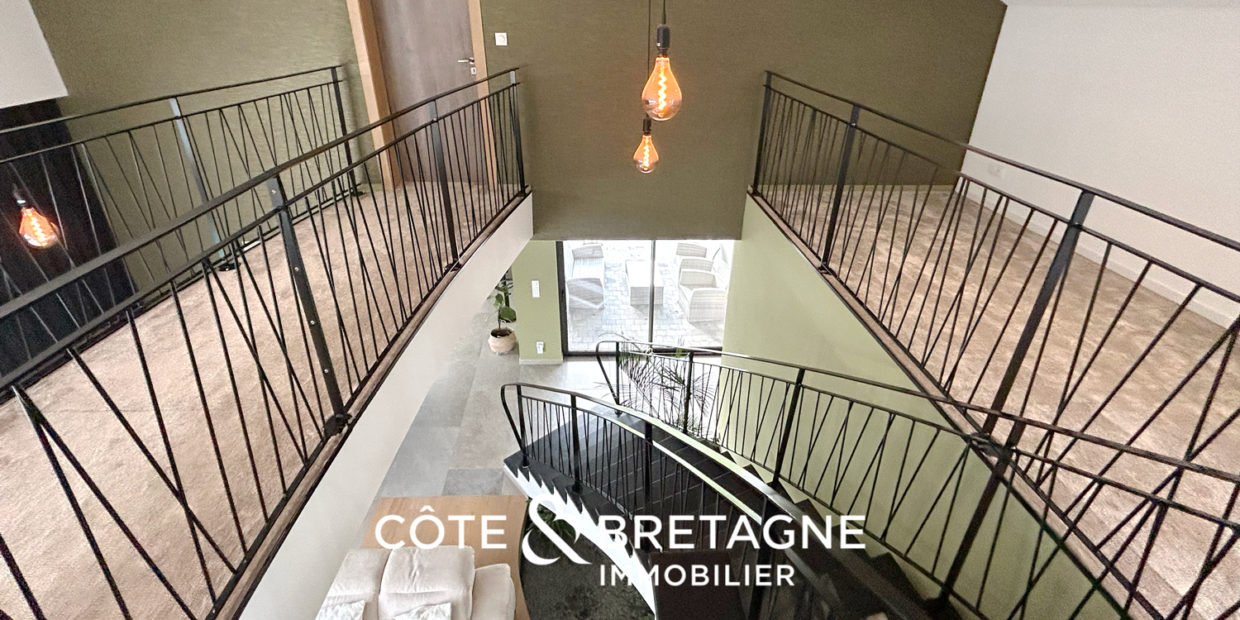 Idéalement située à Pordic, cette propriété d’exception bénéficie d’un cadre de vie rare et recherché. À seulement quelques minutes à pied du centre-ville, des commerces et des établissements scolaires, elle offre également un accès immédiat à un parc boisé et à son étang, véritable havre de paix propice aux promenades et à la détente. Implantée sur un terrain paysagé d’environ 1100 m², cette demeure hors du commun de 240 m² conjugue élégance, confort et prestations haut de gamme.