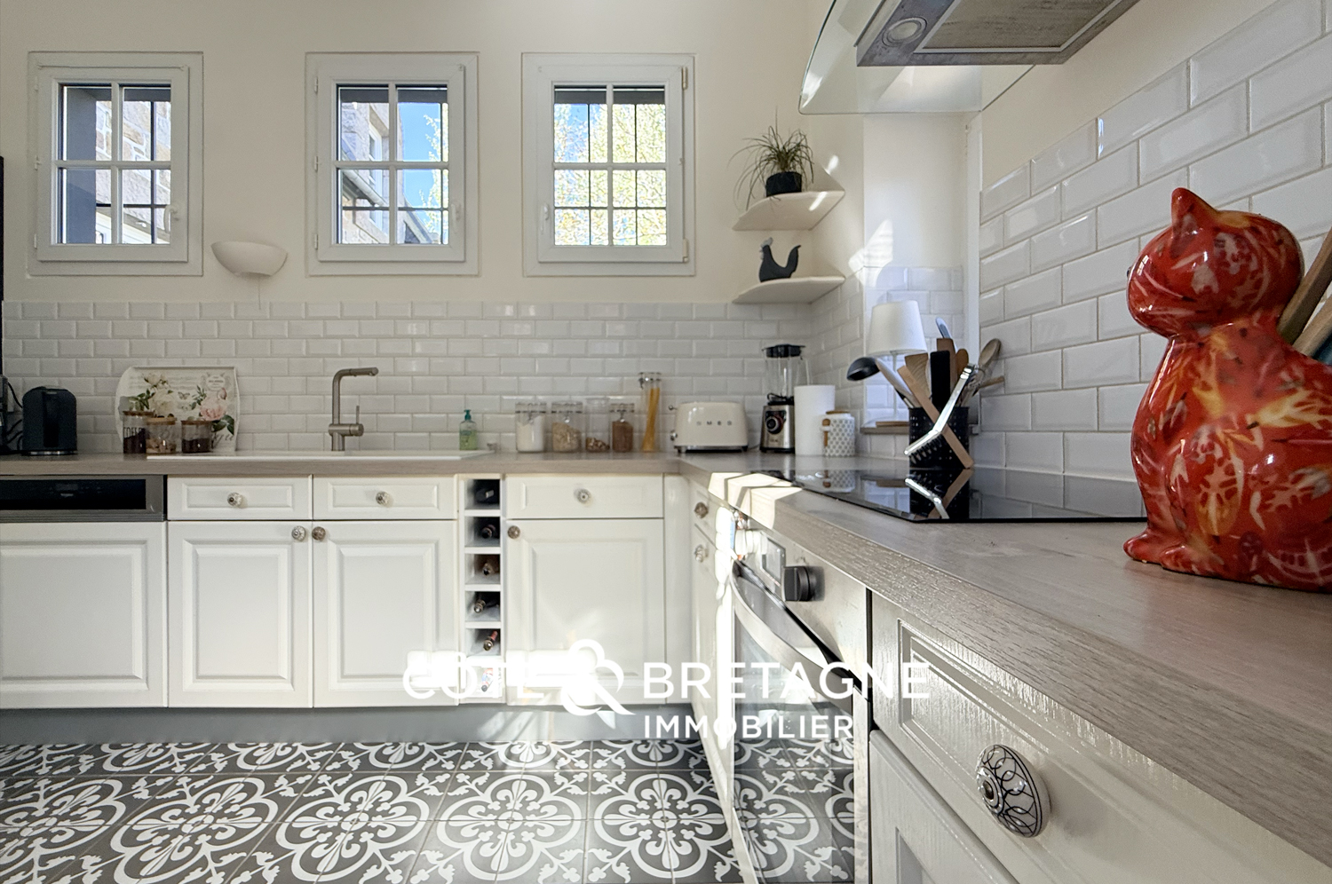 La cuisine, entièrement équipée, bénéficie d’une agréable luminosité naturelle. Un WC indépendant complète le rez-de-chaussée.