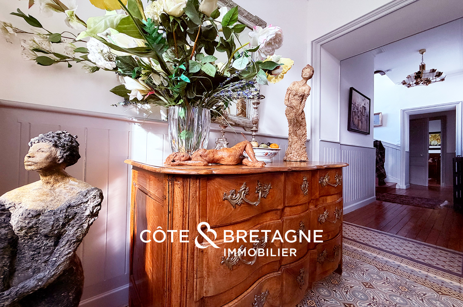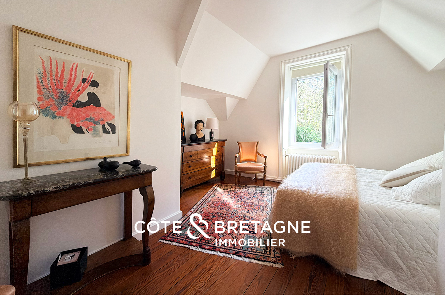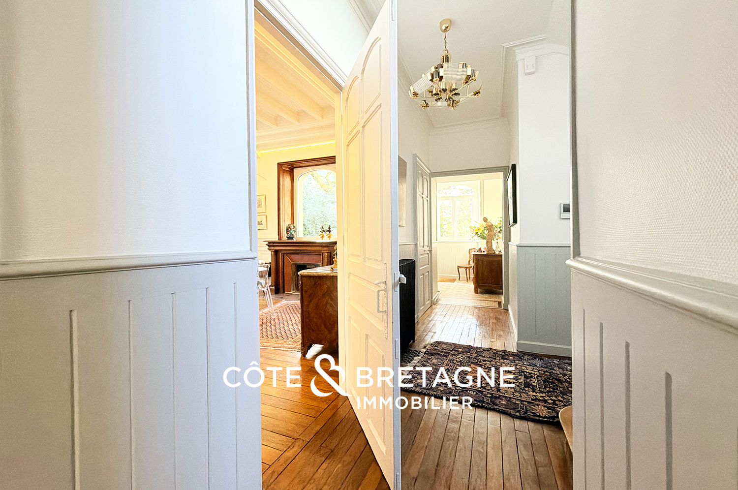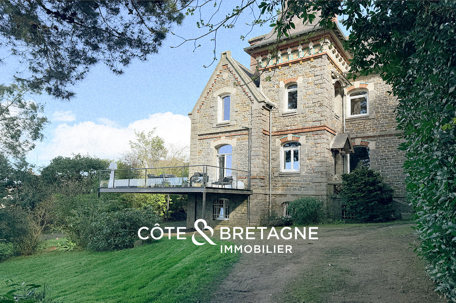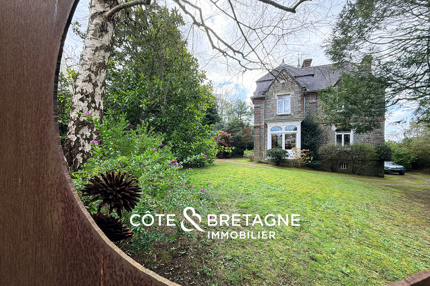 Au cœur du très recherché quartier Saint-Michel à Saint-Brieuc, Côte & Bretagne Immobilier vous présente une propriété de caractère dont l’élégance, le calme et l’environnement privilégié composent une adresse rare. Dissimulée derrière un porche, au bout d’une allée boisée, cette belle demeure du XIXe siècle dévoile une architecture remarquable, portée par une tourelle qui lui confère une silhouette singulière. Dans ce secteur prisé de Saint-Brieuc, cette maison familiale conjugue le charme d’une demeure ancienne et la douceur d’un cadre verdoyant, avec une vue apaisante sur le jardin, les arbres et la nature environnante.
