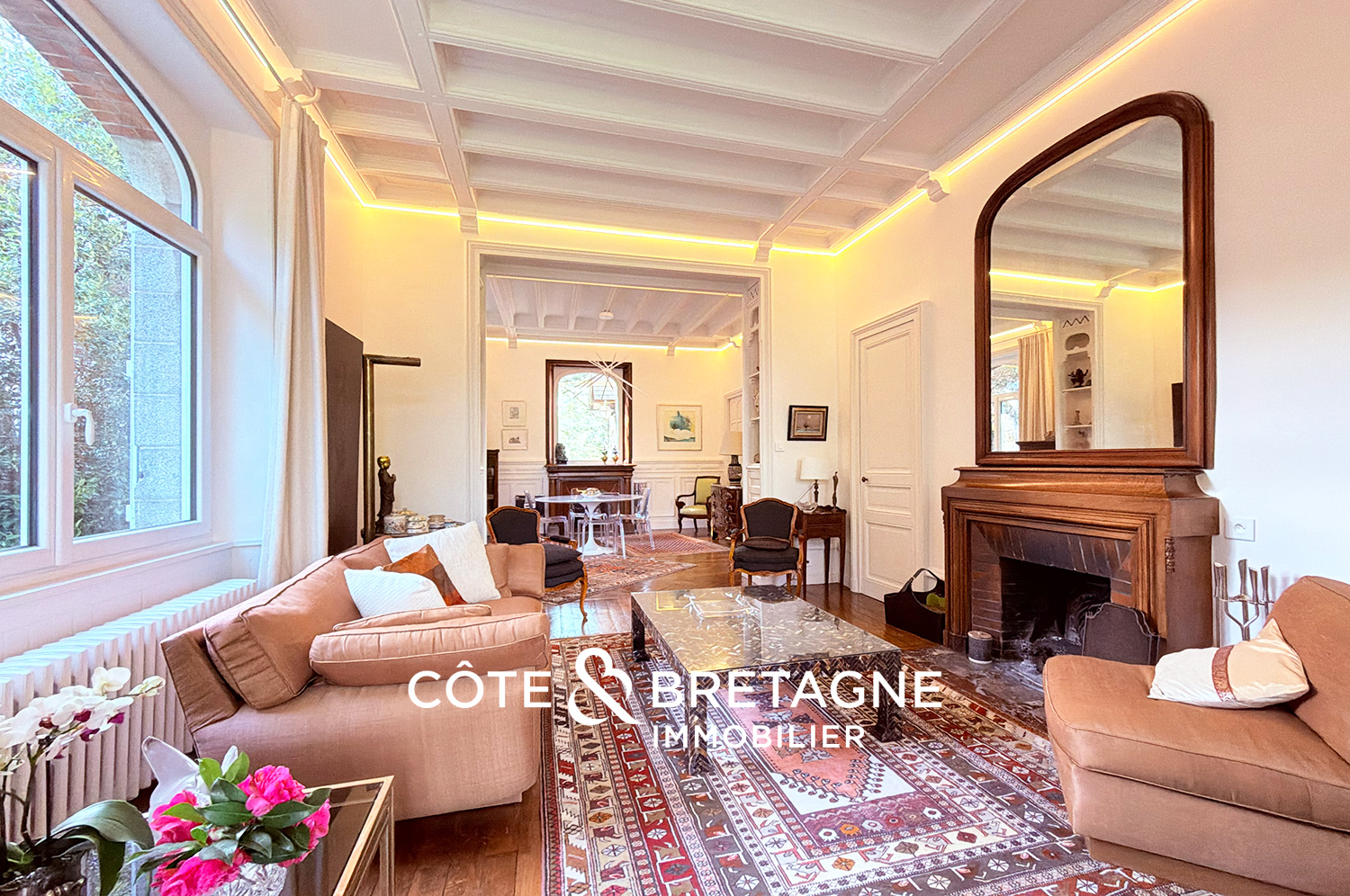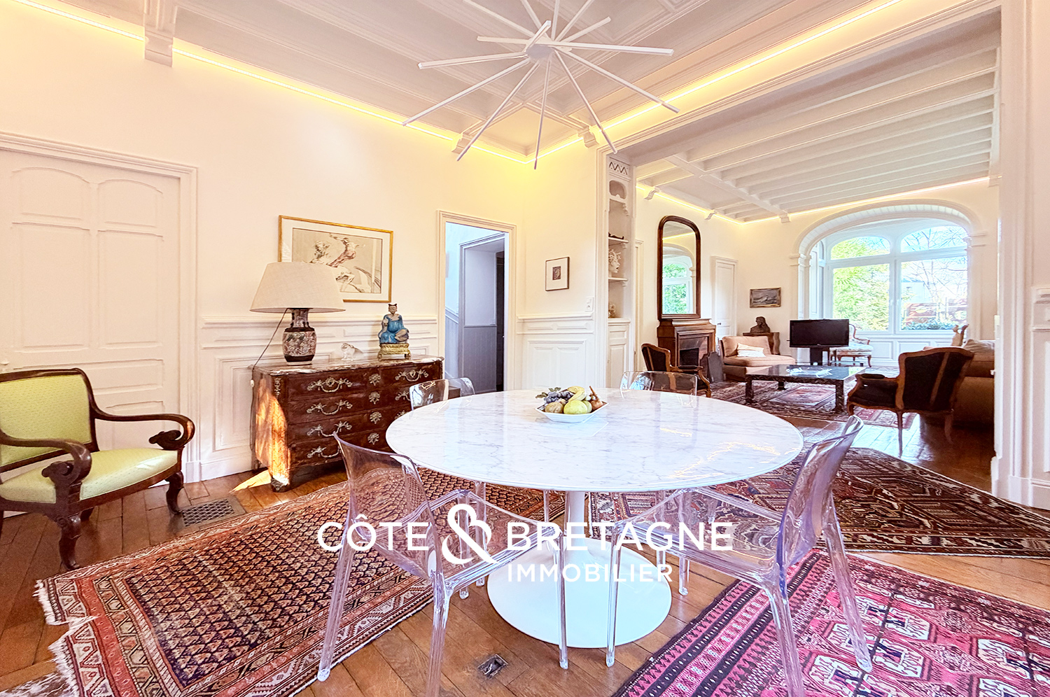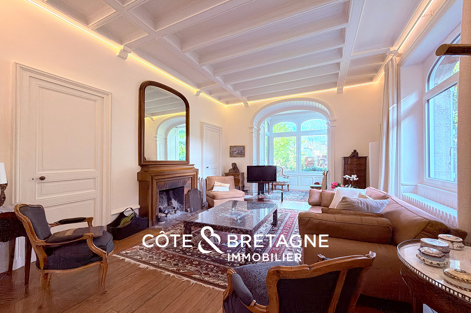 Les pièces de réception, tournées vers le jardin arboré et paysagé, offrent un cadre de vie particulièrement agréable. Le salon, avec sa cheminée et son plafond à caissons, dégage une atmosphère chaleureuse et distinguée. La salle à manger prolonge cette sensation d’aisance et de lumière, tandis qu’un bow-window vient souligner le caractère bourgeois de cette demeure de Saint-Brieuc. Ici, chaque perspective met en valeur la nature, chaque volume laisse entrer le paysage, et l’ensemble invite à une vie intérieure aussi élégante que sereine.