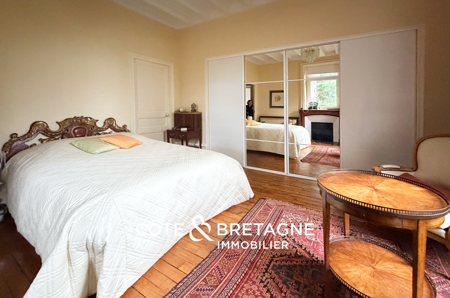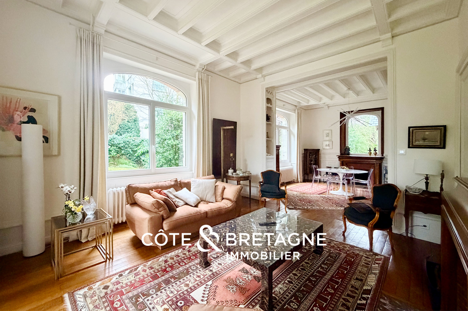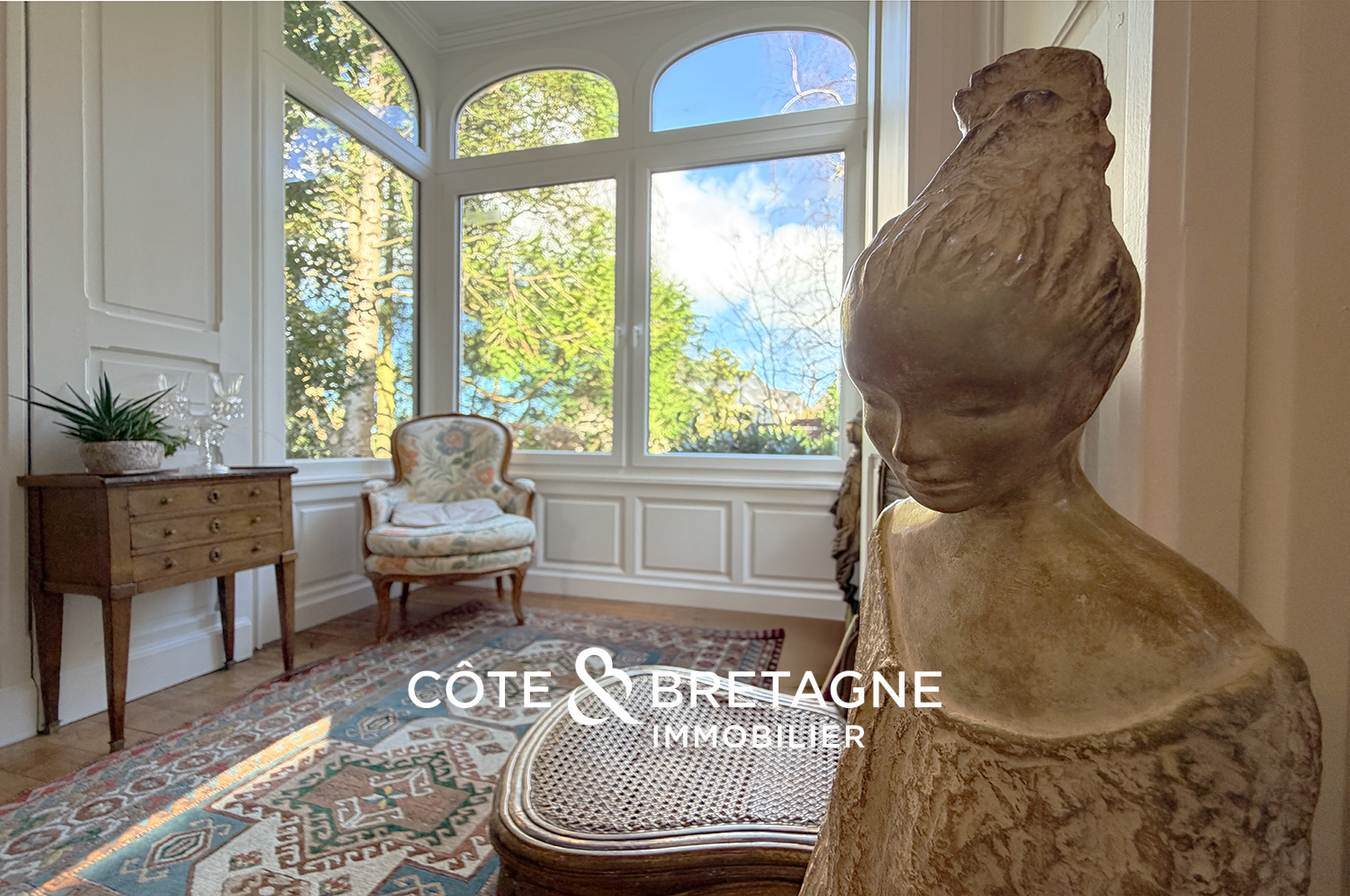 Les pièces de réception, tournées vers le jardin arboré et paysagé, offrent un cadre de vie particulièrement agréable. Le salon, avec sa cheminée et son plafond à caissons, dégage une atmosphère chaleureuse et distinguée. La salle à manger prolonge cette sensation d’aisance et de lumière, tandis qu’un bow-window vient souligner le caractère bourgeois de cette demeure de Saint-Brieuc. Ici, chaque perspective met en valeur la nature, chaque volume laisse entrer le paysage, et l’ensemble invite à une vie intérieure aussi élégante que sereine.