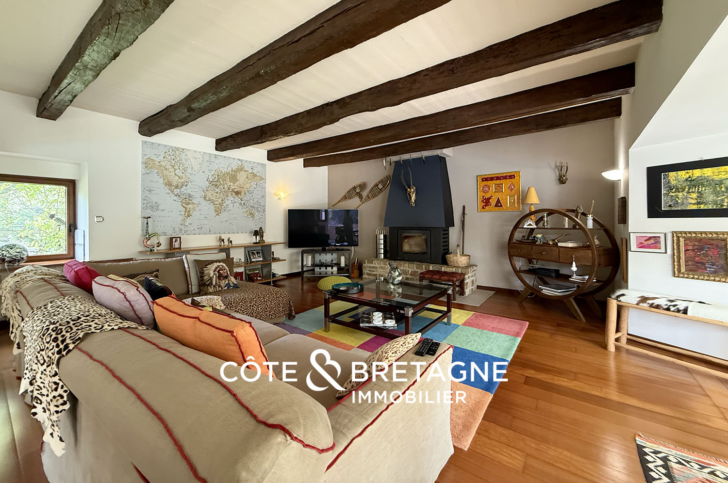Entièrement repensée et rénovée, la propriété déploie des volumes généreux et des perspectives harmonieuses. L’entrée distribue avec fluidité les espaces de vie et l’espace nuit, préservant intimité et convivialité. La pièce de réception de 63 m² séduit par ses poutres apparentes, ses boiseries et sa cheminée à insert, ouverte sur le jardin. En continuité, une cuisine aménagée et équipée invite à partager les repas en famille, complétée par une arrière-cuisine fonctionnelle avec accès direct vers l’extérieur.