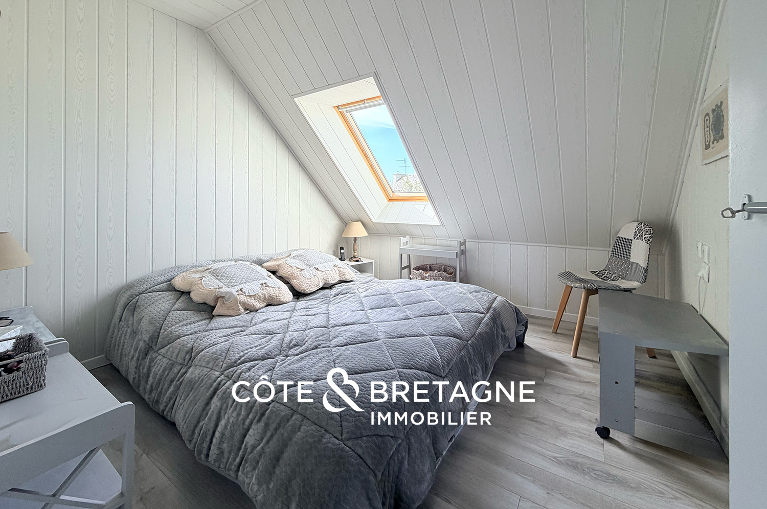 À l’étage, un vaste palier distribue l’espace nuit. On y découvre trois chambres, une salle de bains et d’eau ainsi qu’un WC indépendant. Cette configuration offre un cadre de vie idéal pour une famille ou pour toute personne souhaitant s’installer en Bretagne dans un environnement à la fois calme et proche de toutes les commodités.